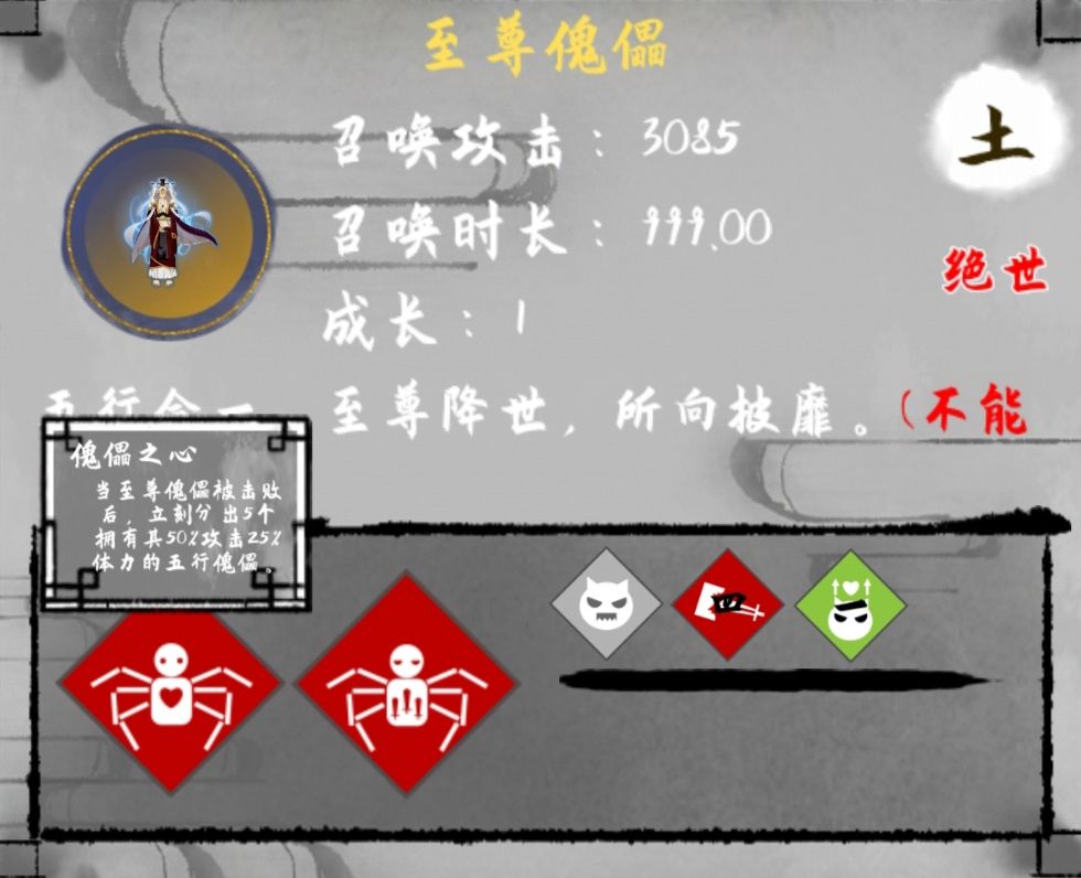 特效一:开场召一个小傀儡,小傀儡死后裂开成5个大傀儡。注:每次战斗只能召一次。