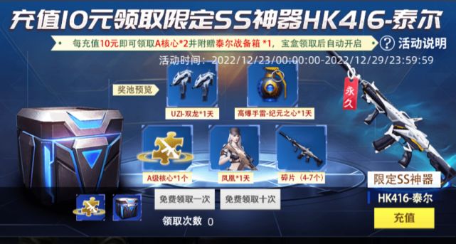 今天小白为大家来详细解析一下这次10元充值领取ss级武器HK416-泰尔的活动(活动时间2022年12月23日到2022年12月29日)每充值10元就可以领取A级核心*2加泰尔战备箱*1,领取到之后宝箱会自动开启。泰尔战备箱内奖励包含(HK416-泰尔、UZI-双龙、高爆手雷-纪元之心、凤凰、A级碎片、可合成碎片)获取概率分别为:UZI-双龙(1天)17%
