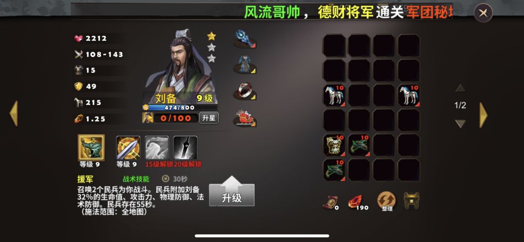 英雄选择刘备、关羽,防御塔使用寒冰塔、天雷塔,战术卡使用富豪、练兵、破敌、术塔精通,刘备、关羽装备如图所示