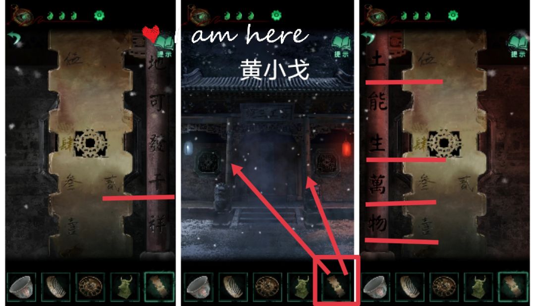 20.(大门外),用获得的线索对照大门两边的柱子,得到信息:物千万生土