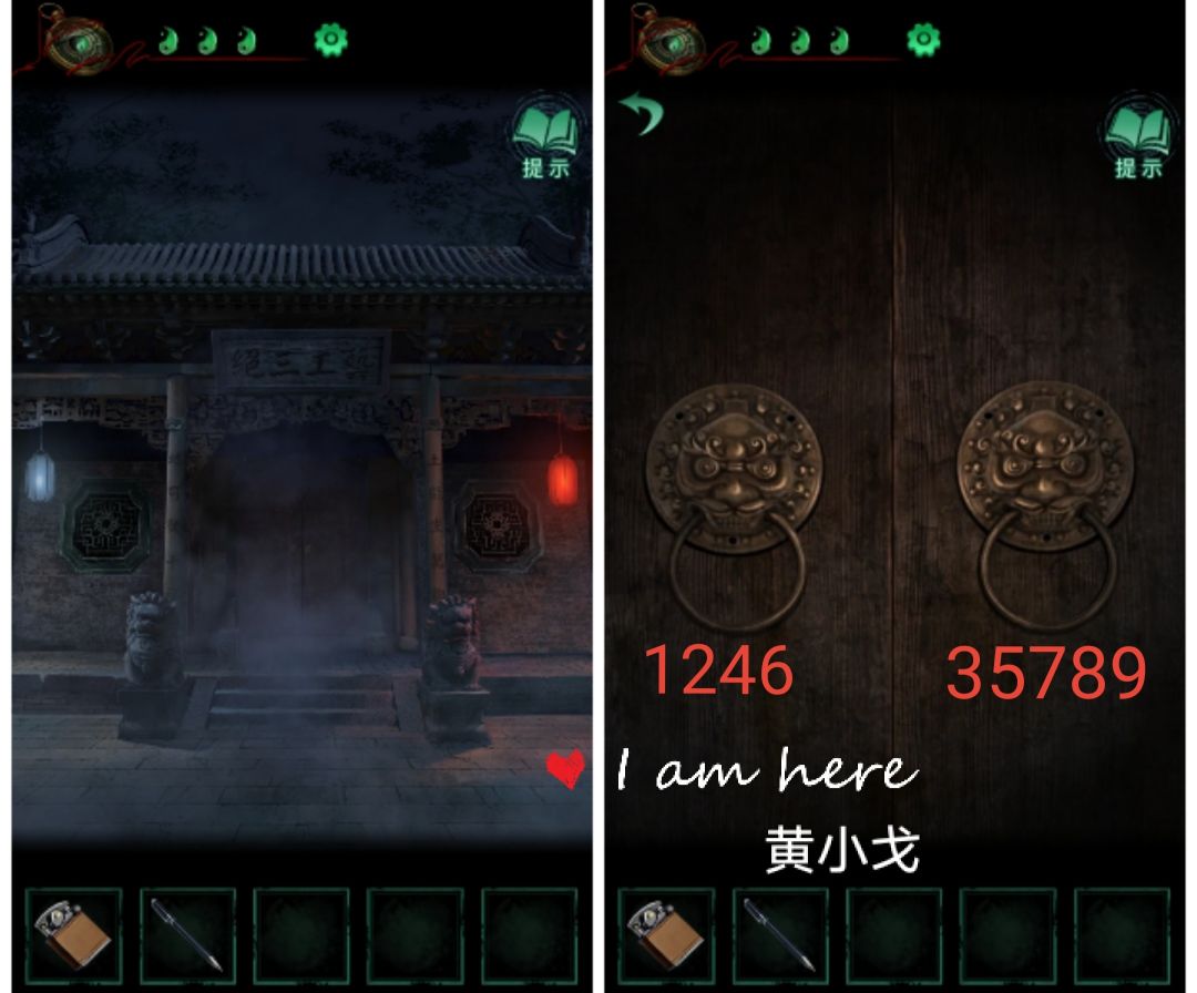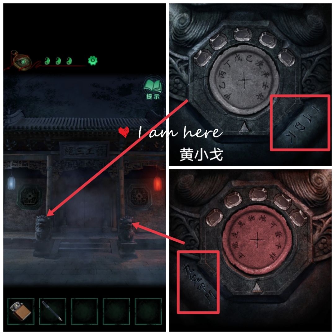 4.点击大门,结合两个石像的信息,按(左左右左右左右右右)顺序点击门环,打开门,进入(主院)