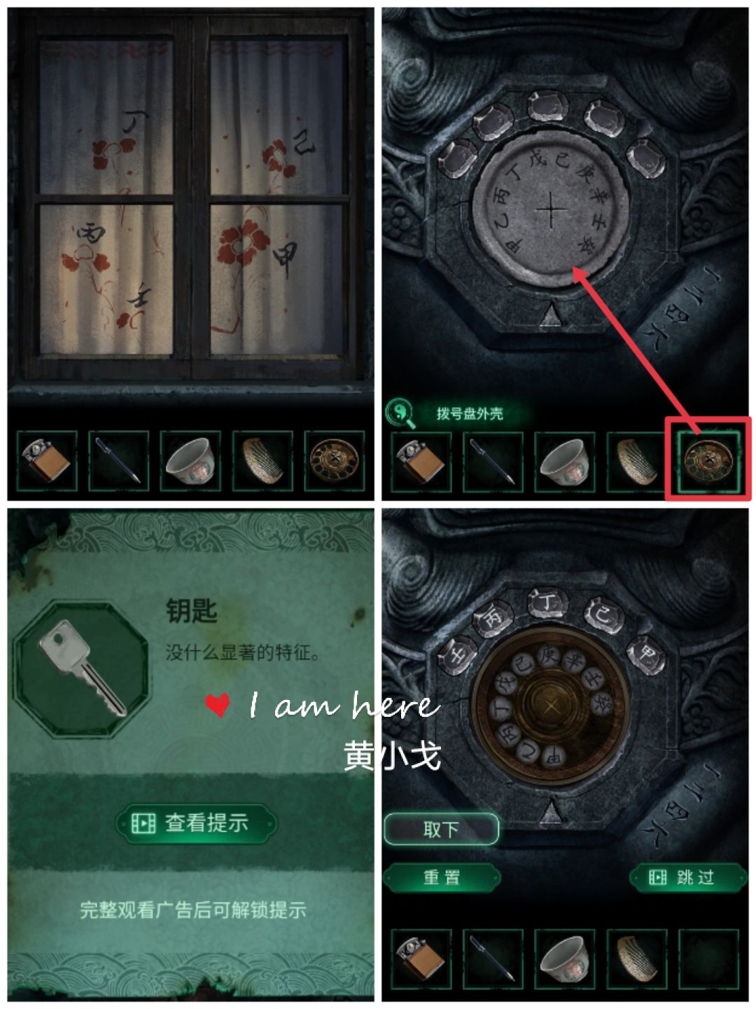 14.(大门外)把【拨号盘外壳】放入左边的石像,根据窗户上的线索完成石像小游戏1(壬丙丁己甲,把所需的字转到△上),获得【钥匙】,取下【拨号盘外壳】