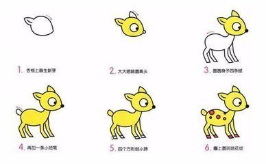 小朋友们,这是一只黄色的小鹿,它在绘画技巧当中,只有6个步骤,今天我就来教你们画黄色的小鹿6个步骤。 1.第一步,先画出小鹿它的头还有耳朵。 2.第二步,再画上小鹿它的眼睛还有鼻子,再将头涂上颜色。 3.第三步,再画上小鹿的身子。 4.第四步,再画上小鹿它的尾巴,再将小鹿的身子涂上颜色。 5.第五步,再将小鹿的尾巴涂上颜色。 6.最后一步,再将小鹿的身子画上条纹。 这就是一只黄色的小鹿,用6个步骤就画好了。