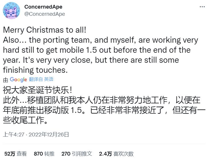 《星露谷物语》制作人 Eric Barone 宣布1.5版本会在年前登陆移动端(虽然比主机版迟了一年多)。