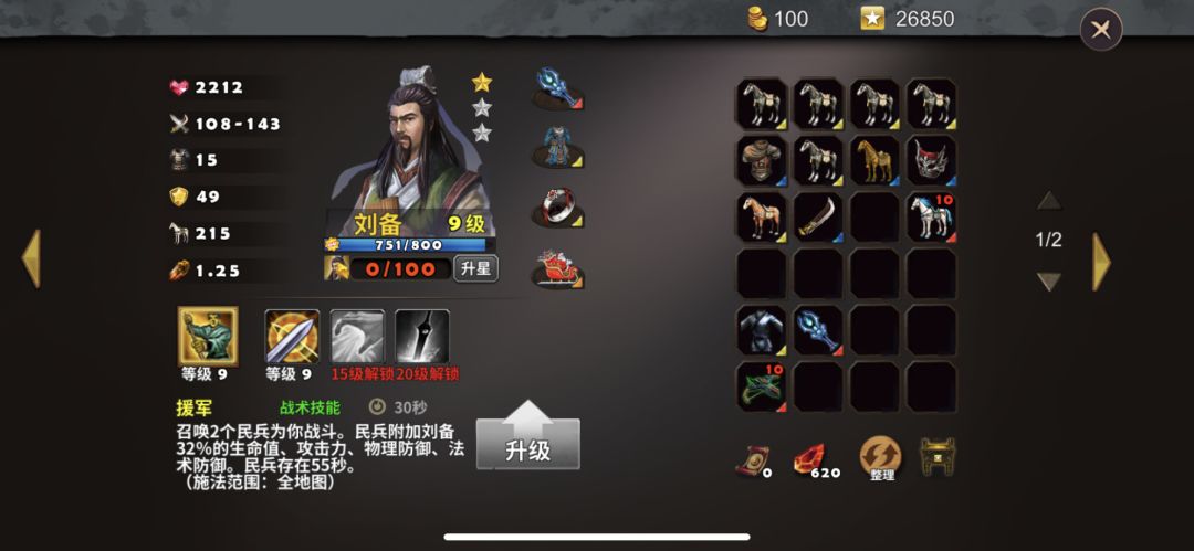 英雄选择刘备、关羽(有人想问为什么老是用他俩,因为他俩等级高可以使用高级装备),防御塔使用寒冰塔、天雷塔,战术卡使用练兵、破敌、富豪、术塔精通。刘备、关羽装备如图所示