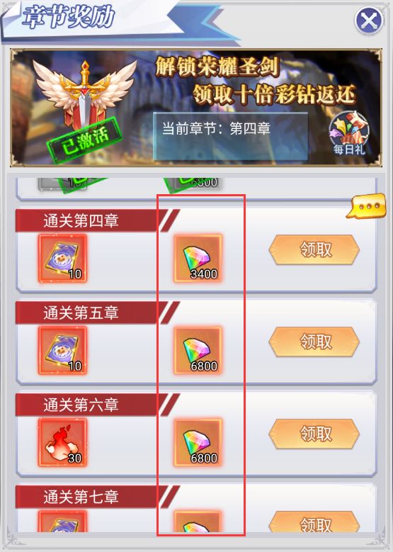 3.68元荣耀圣剑,10倍彩钻【主城】-【章节奖励】中开启,可以领取更多连抽+钻石等)
