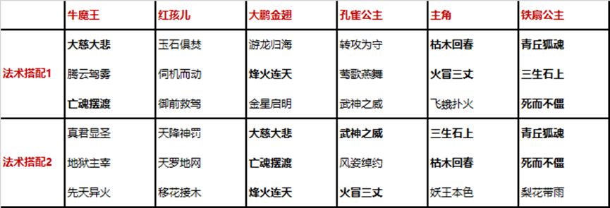 法术搭配2:这套法术搭配更注重均衡,没有把全部的宝都押在前期。前期的主要战力在大鹏身上,后面由牛魔王来接管战局,整体阵容的搭配更注重成长性。第1套法术重点是要打架,粗暴的打架,力求快速解决战局,这套则是尽力避免对抗,应用控制类法术,减少受到伤害的次数,力求活下来。