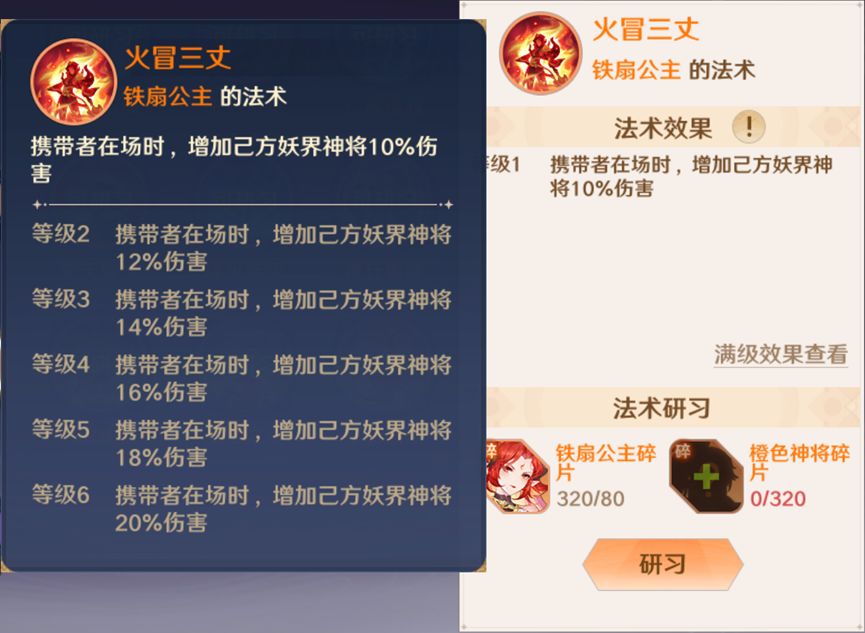 假设我们要学习铁扇公主的法术【火冒三丈】,我们得先解锁铁扇公主,然后再收集80枚铁扇公主碎片+320枚任意橙色神将碎片,这样我们就可以研习法术。