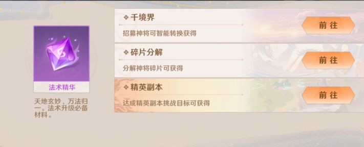 学会法术后可以对其进行升级,同样需要相应神将碎片以及法术精华,法术精华可以通过分解神将碎片、挑战精英副本获得,法术等级越高升级所需的法术精华越多。