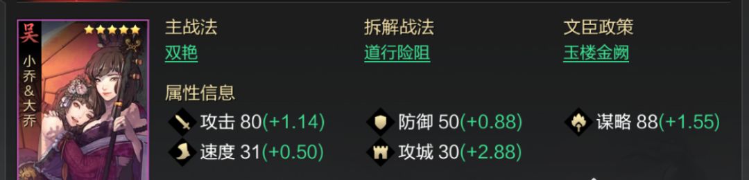 二乔的主要属性:谋略值,加上女武将每10级多的5点,相当于+2.05,不算很高。二乔的防御值偏低,遇到爆头型的物理武将很危险。