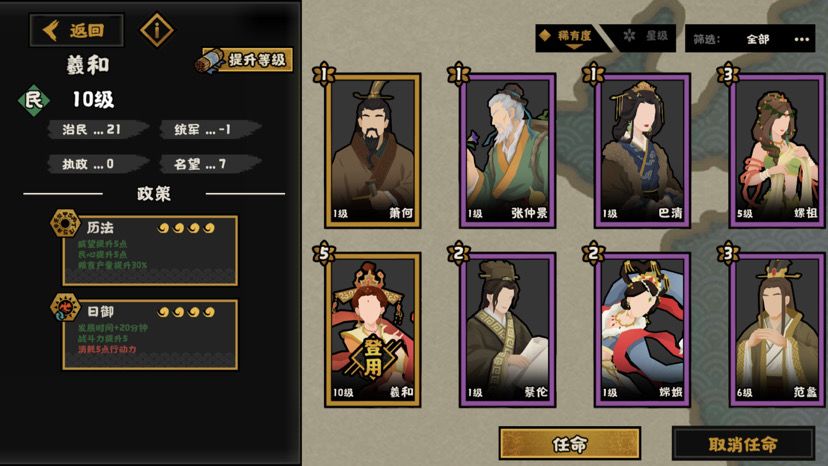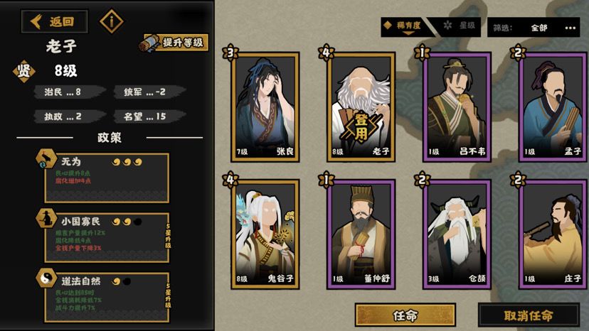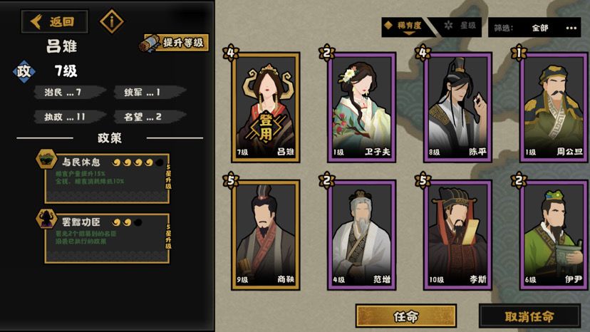 全图抓人是非常好玩的一个套路,萧何可以全图招募名臣,吕雉最高可以罢免3个名臣并承袭其政策,也就是说只要地图选对了,可以同时用4+3+3=10个名臣,想玩什么玩法都可以。想玩潜谋的抓鬼谷子,想玩战力的抓军事名臣,慢慢选,耐玩。