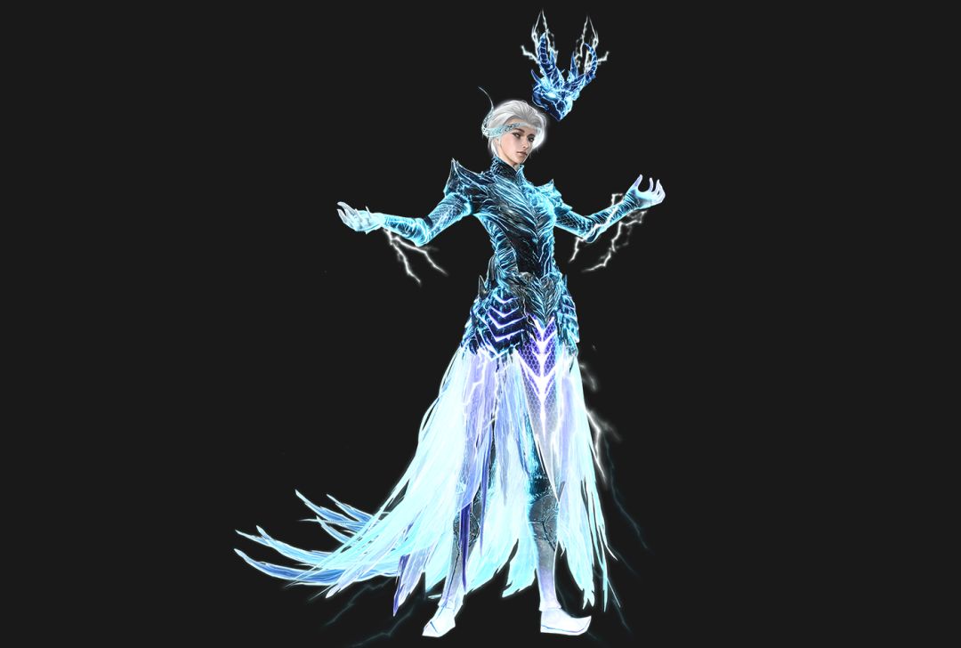 女装的设计在简洁干练的基础上,添加了看起来凌厉的羽毛样裙摆和装饰,用尖锐的样式营造闪电刺破长空的氛围,以雷电为头饰,将雷光纳入掌中,化为己用,展现雷神之威严。