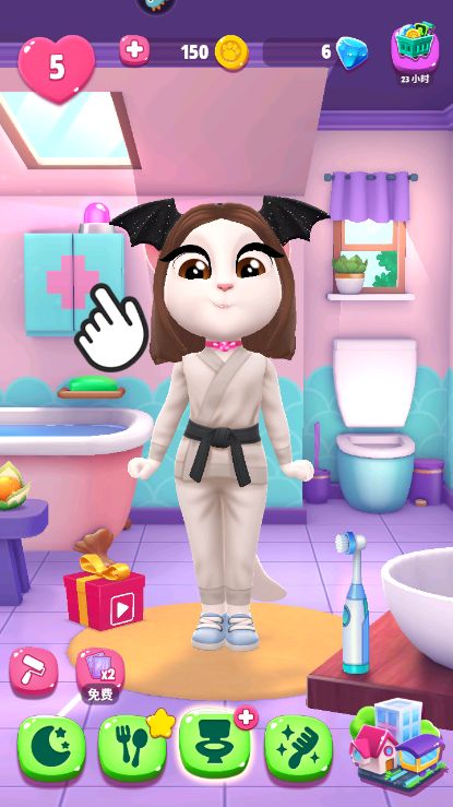 说到要注意的地方,就是安吉拉的第三个选项啦,其实这个选项除了上厕所,洗澡之外,还有一个治病的状态哦。有时候我们误以为安吉拉要上厕所,其实点进去后再等等,就会有系统的提示点击左上方的小药箱,然后选择正确的医疗器具帮助安吉拉治病,这样状态栏就可以恢复正常啦!