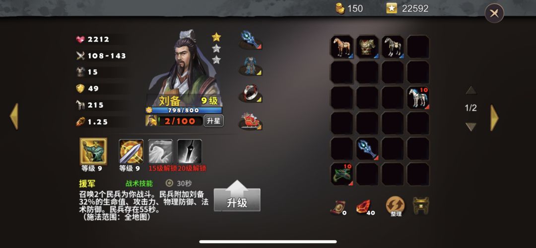 英雄选择刘备、关羽,战术卡使用火焰塔、天雷塔,战术卡使用练兵、富豪、术塔精通、破敌,英雄装备如图所示
