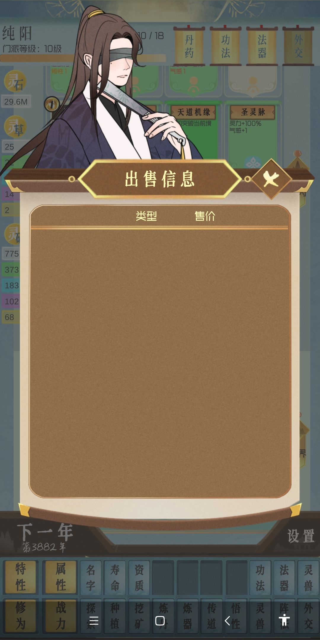 武器:武器可以加相关数值,如果你想让某人去炼丹,他炼丹指数又只有20,那么你可以找加炼丹指数的武器给他装备(武器同样有属性限制,但是没有境界限制)。