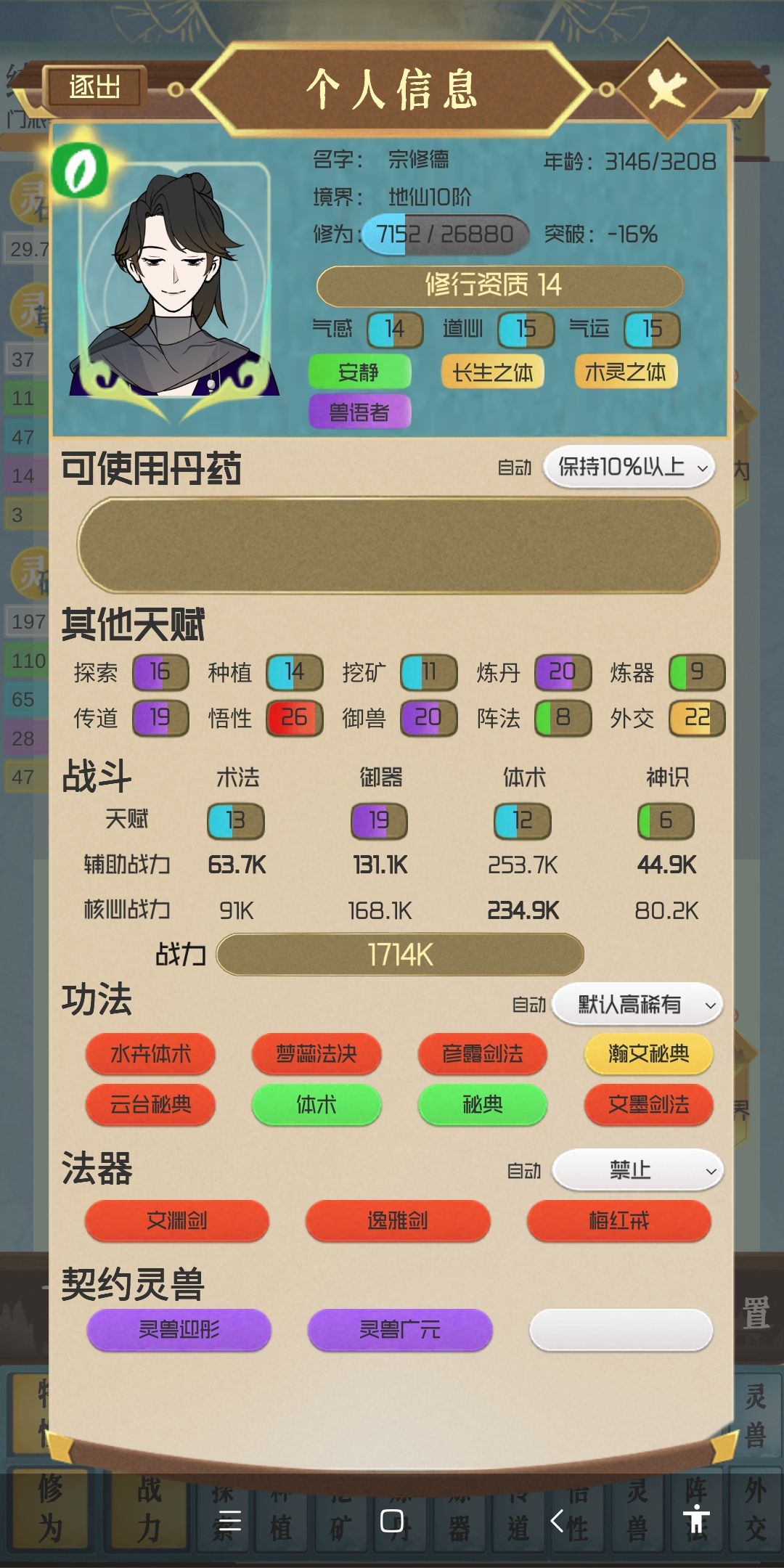 修行资质:比较重要,单人认为会影响后期长修为的快慢,一般会刷到14以上