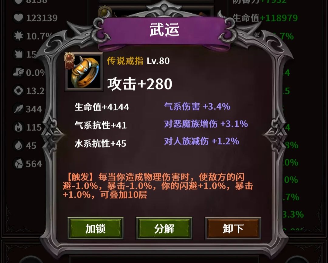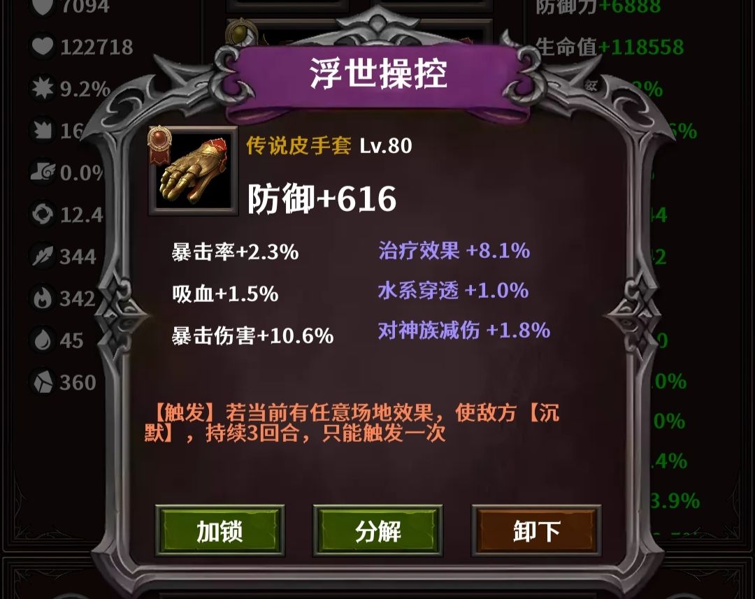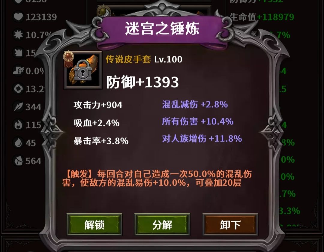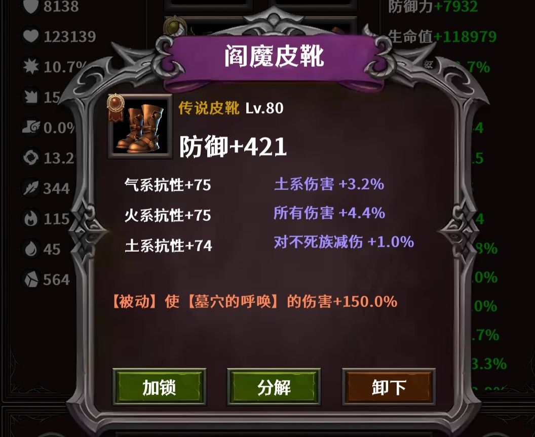 手套:迷宫之锤炼,收集换。属性找攻击力、所有伤害,副混乱的核心装备。扛不住上1级骷髅、僵尸,还是扛不住换成浮世操控,输出差很多。