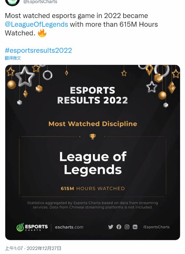 今日(12月27日),据数据的分析机构Esports Charts消息,《英雄联盟》成为2022年收视率最高电竞游戏,游戏直播总观看时长超过6.15亿个小时。