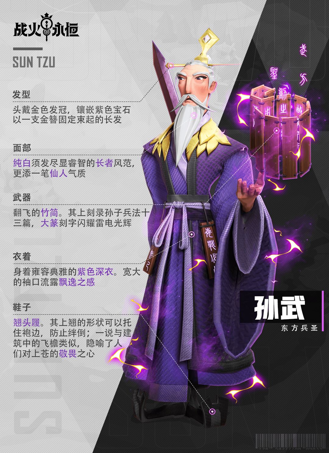 角色设计师利用纯白的须发、修长瘦削的身段还原孙武睿智的形象。一袭紫色深袍,宽大的袖口随风飘舞,呈现独具东方魅力的飘逸质感。下图是孙武角色各部细节的设计思路,一起来看看吧~