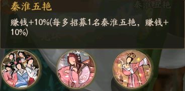 秦淮五艳,赚钱增加百分之10,每招募一个秦淮五艳的门客就会增加百分之10,。秦淮五艳的门客一共是5个,全部招募的话可以增加百分之50的赚钱的。