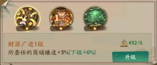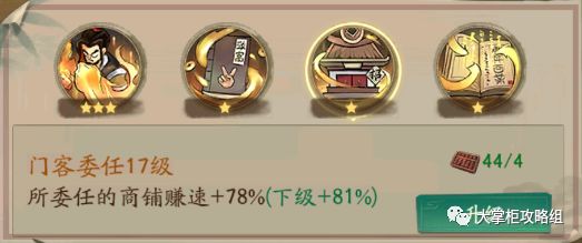 门客委任,这个技能加赚速是非常的快的,会增加门客所委任的商铺赚速而且是百分比的赚速加成。需要消耗算盘来进行升级。门客委任的有个小技巧,等级高的尽量往基础赚速比较高的商铺上委任。