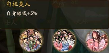 勾栏美人,会增加自身百分之5的赚钱,这个技能是可以升级的。