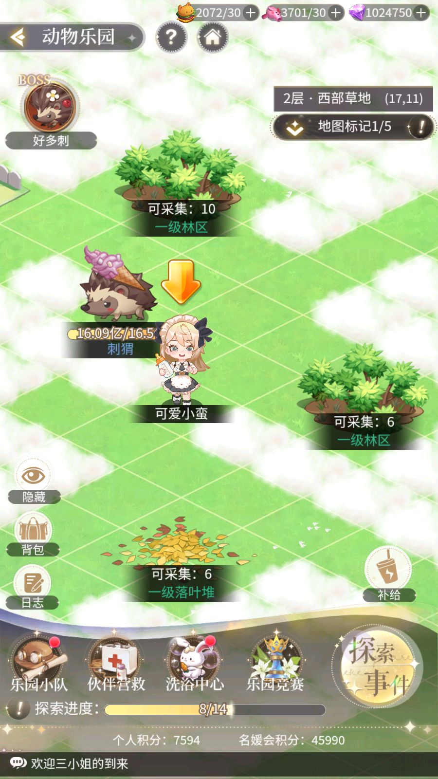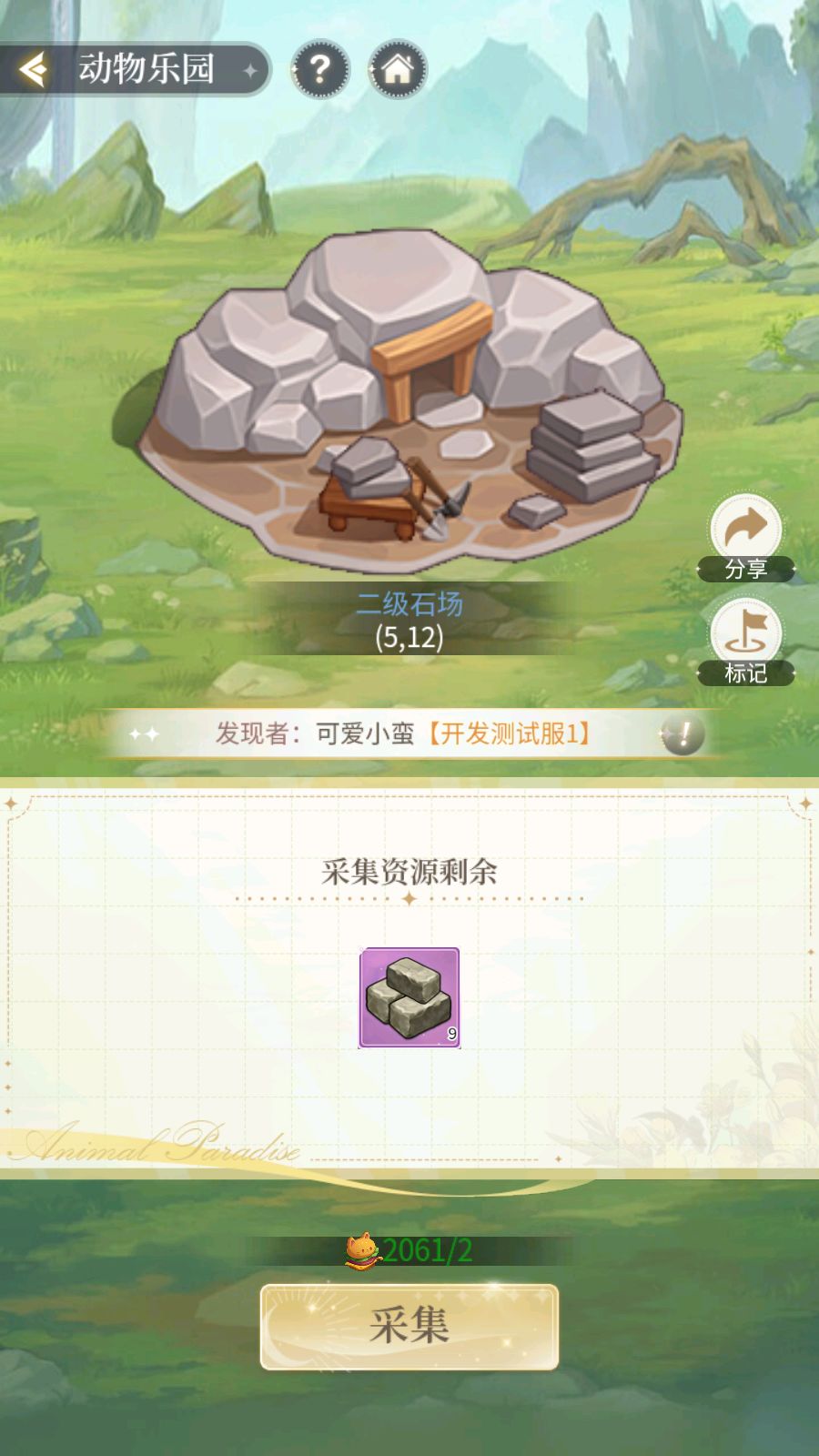 收集资源:可消耗体力对分布在乐园内的资源点进行采集,采集的资源将自动存储在采集背包内,可给予对应的动物完成其需求。
