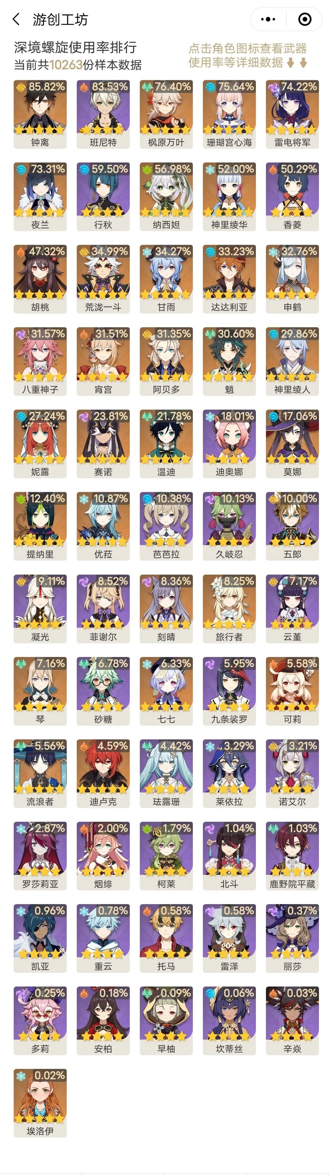 刻晴的使用率则继续保持稳定,在须弥引入新体系后,刻晴在各种深渊环境都有不错的发挥,鲜有不好打的环境。