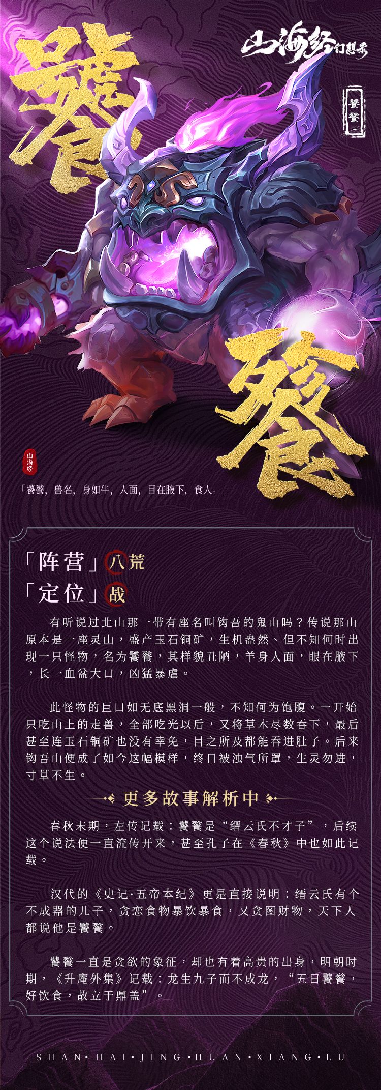 有听说过北山那一带有座名叫钩吾的鬼山吗?传说那山原本是一座灵山,盛产玉石铜矿,生机盎然、但不知何时出现一只怪物,名为饕餮,其样貌丑陋,羊身人面,眼在腋下,长一血盆大口,凶猛暴虐。