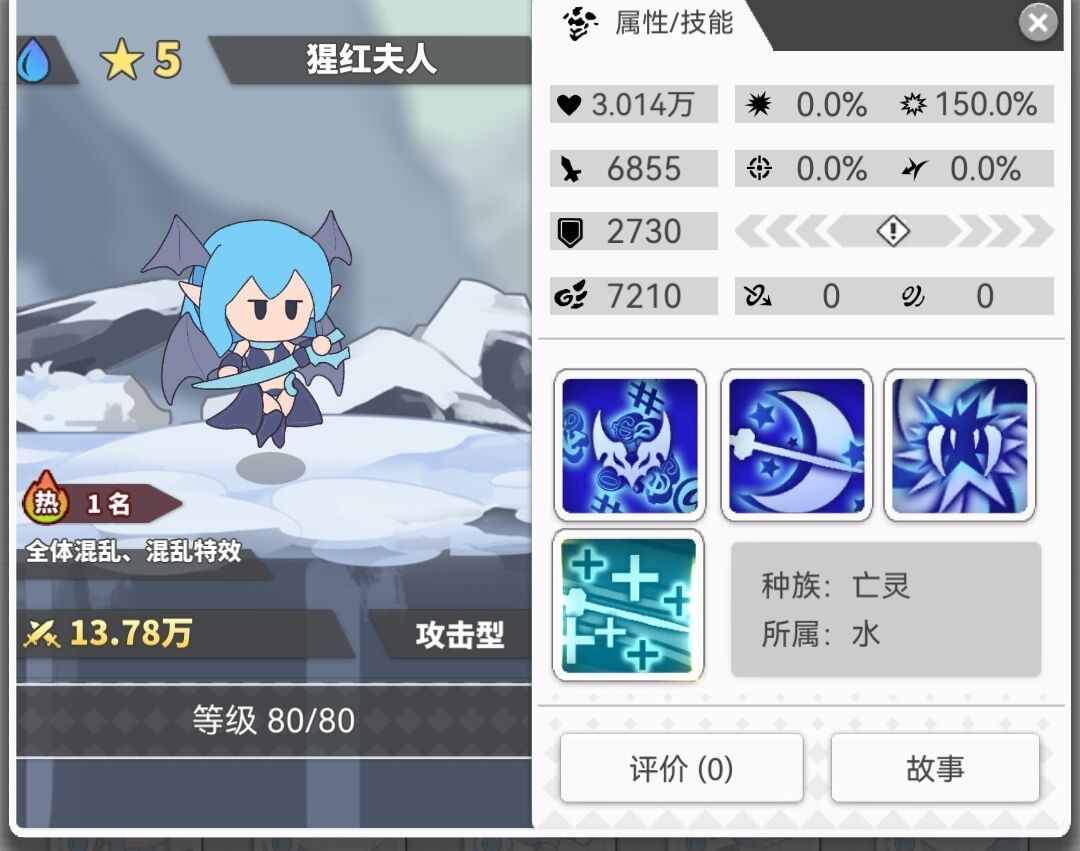 水夫人本身不算慢的初始速度,以及技能的全体混乱,在抢速成功之后,可以给队伍的爆发使魔,足够的输出时间,直接造成减员。属于一个万金油的使魔,推图爬塔打PK都有一席之地。