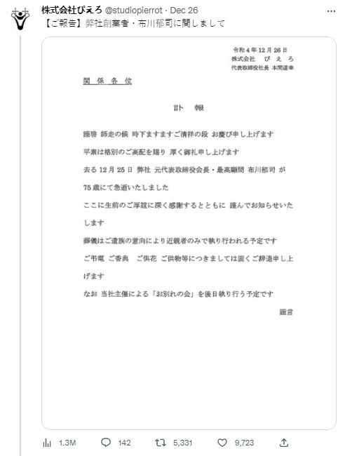 日本动画制作公司Studio Pierrot官推确认,其创始人兼董事长布川雄二于2022年12月25日不幸离世,享年75岁。