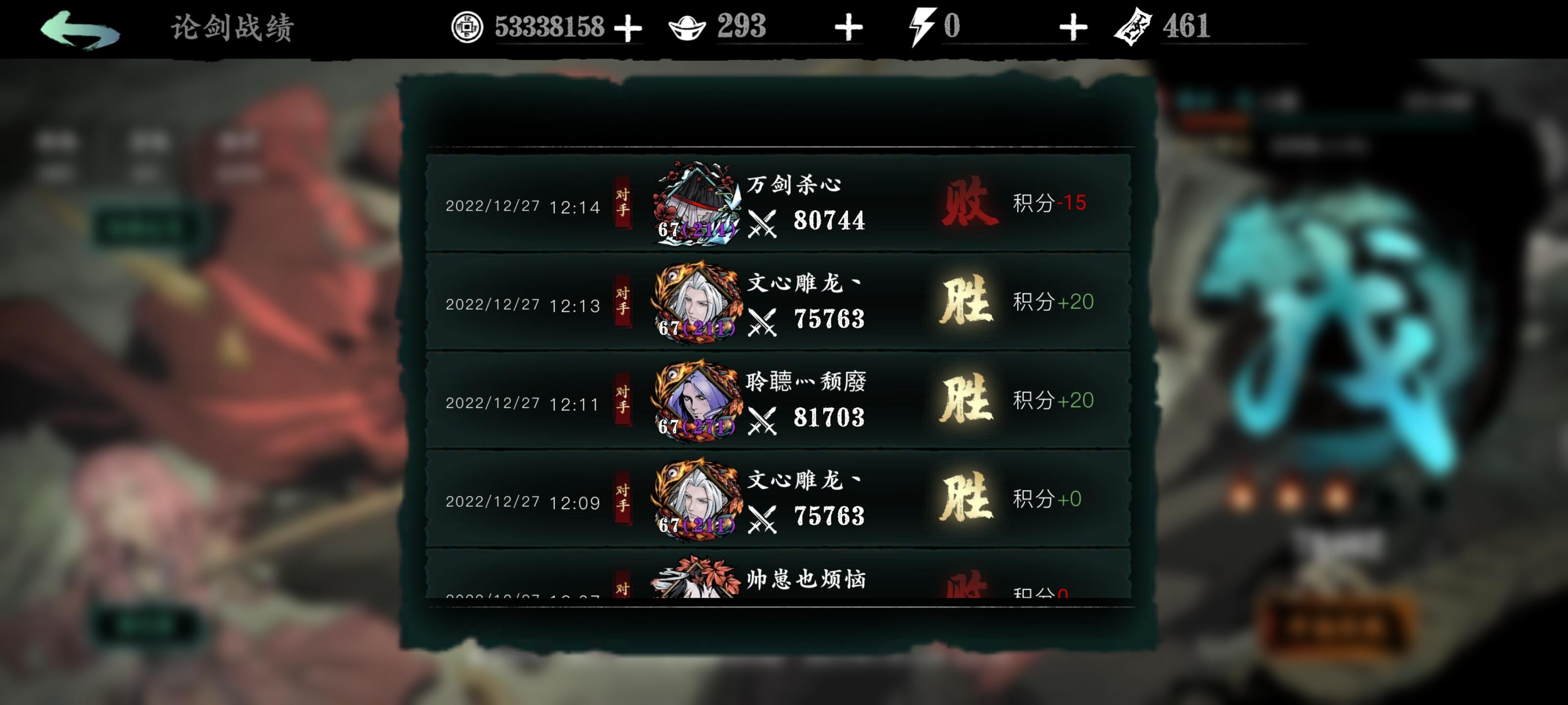 一般来说,一天五把 但有的时候一气一上头就会多打几把,导致胜率咔咔往下掉,从70——62,在我看来更多还是看运气。轻语大家都说很强势云云,但是在我看来也就一般,真的一般,看论剑榜就能看出来了,第一虽然是轻语,但其实和轻语并无太大关系(普攻套狗都能用)我虽然练度一般,但应该也到了平均水平 我来说一下对于几个主流论剑职业的看法: