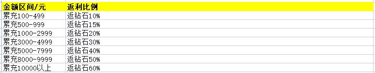 【活动规则】:此活动为单日累计充值,活动期间单日累计充值达到以下档位,可领取对应档位比例的钻石返利,单日累计,次日重置;