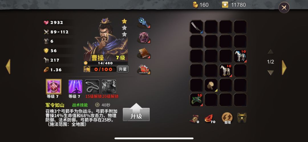 英雄选择曹操、夏侯惇,英雄装备如图所示,防御塔使用天雷塔、火焰塔,战术卡使用练兵、破敌、术塔精通、三昧真火。