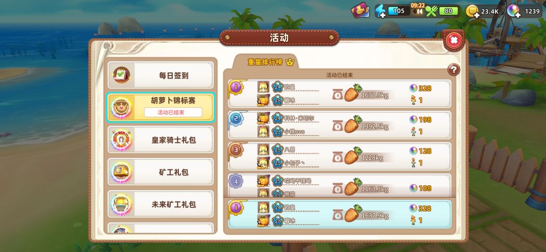 比赛具体内容为两个人组队,在比赛期间累积起来的巨大胡萝卜重量,然后进行排名