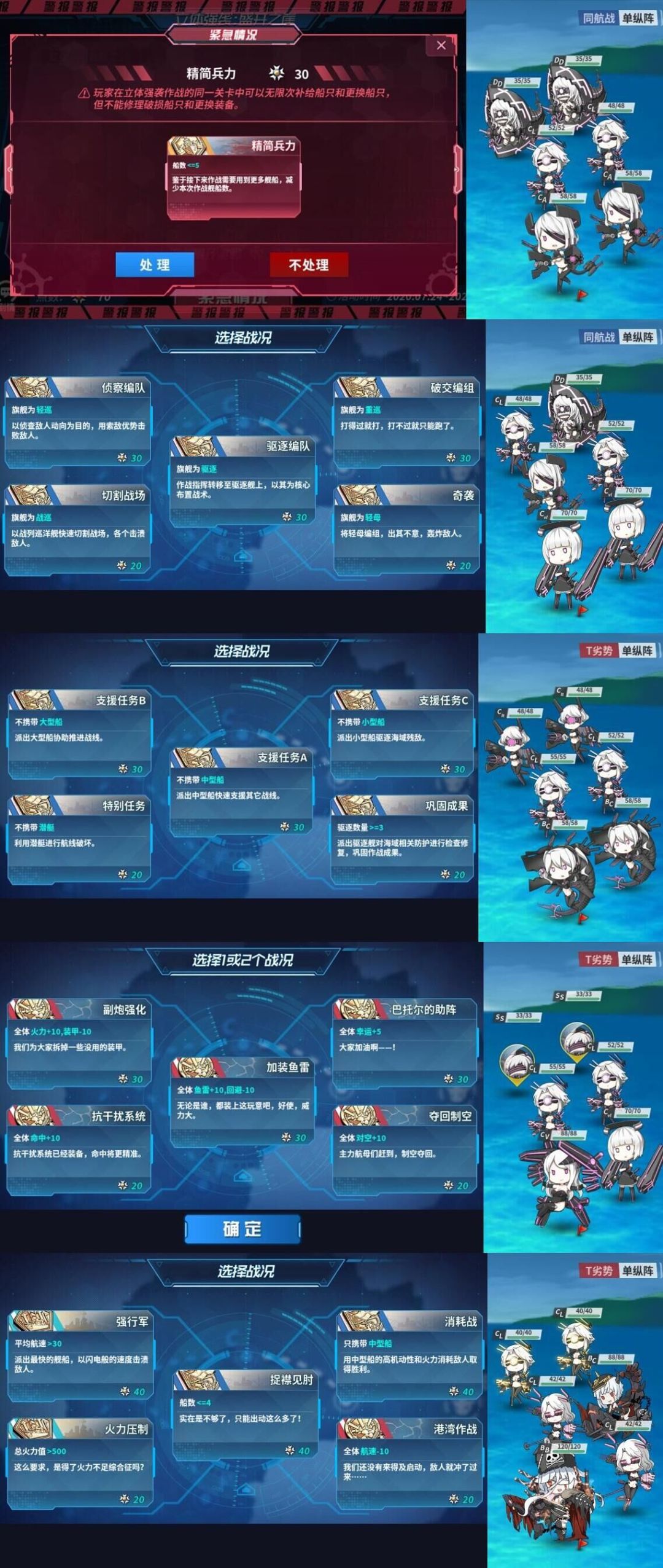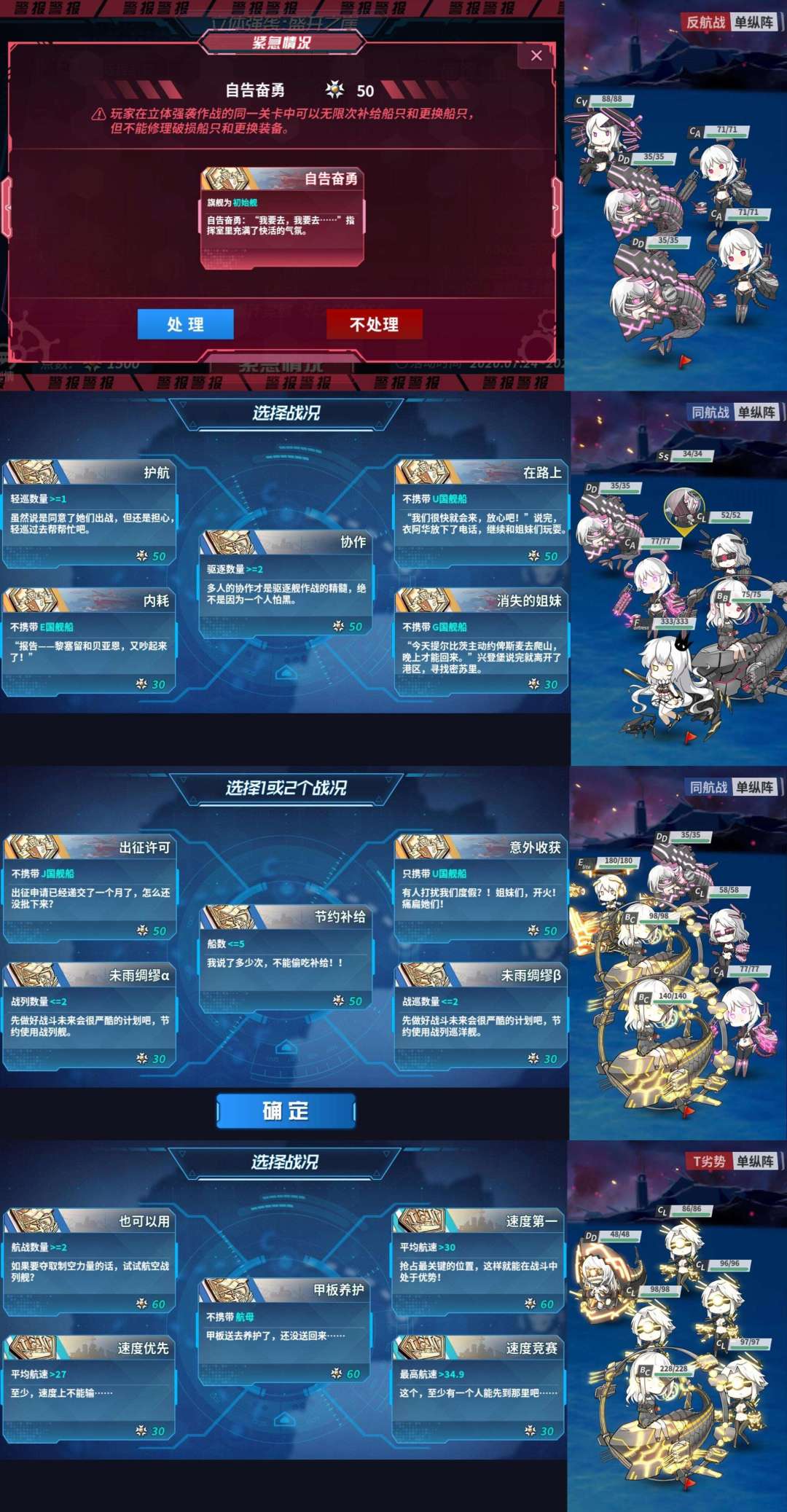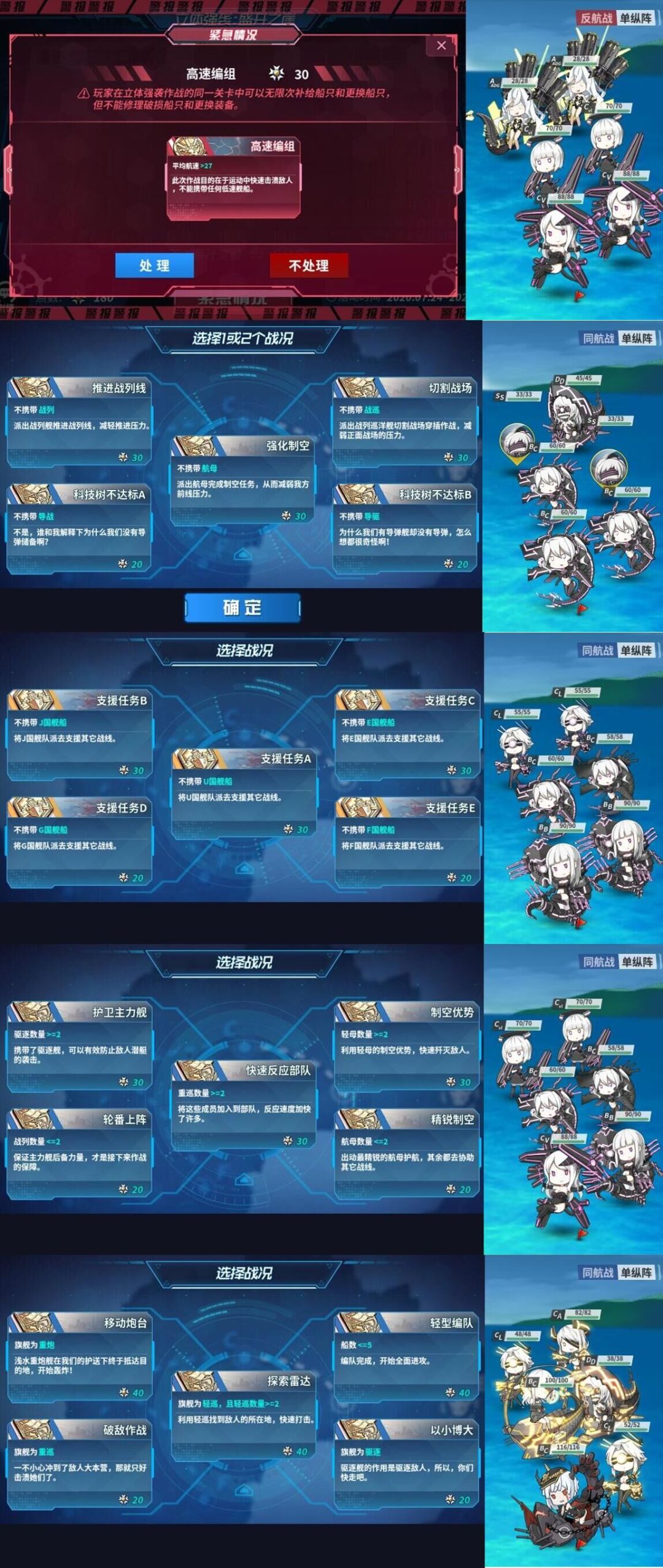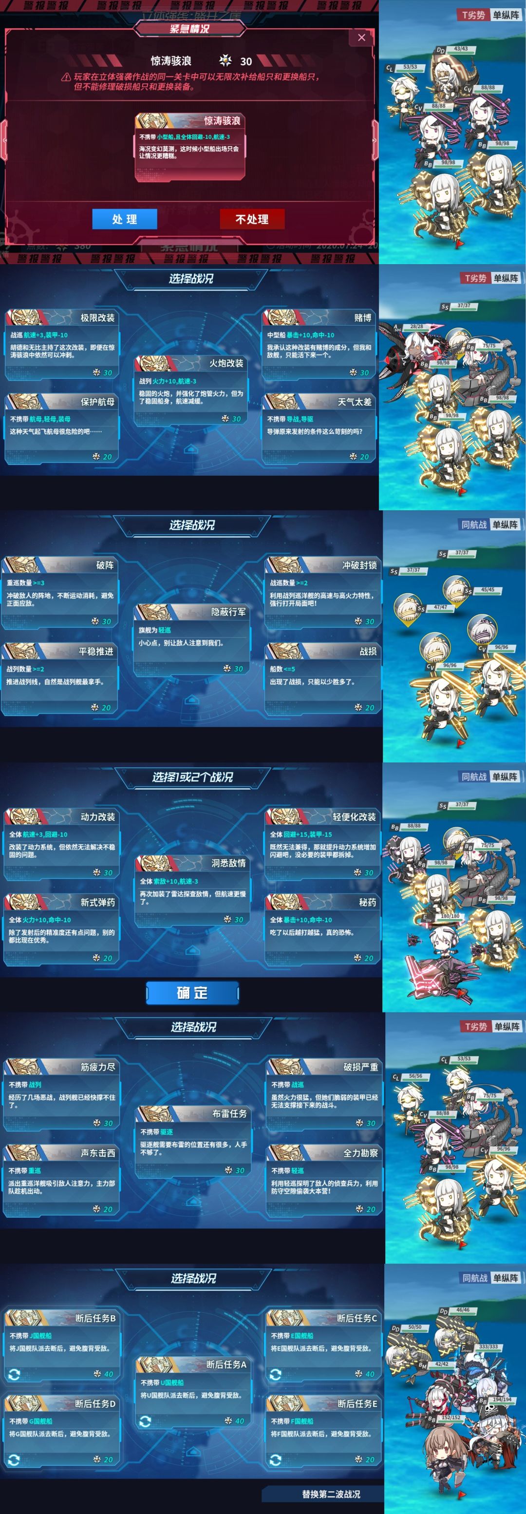 选择的路线:处理紧急战况;第二波选择旗舰驱逐;第三波选择不带中船;第四波选择全体幸运 5以及全体火力 10,装甲-10;第五波选择平均航速>30
