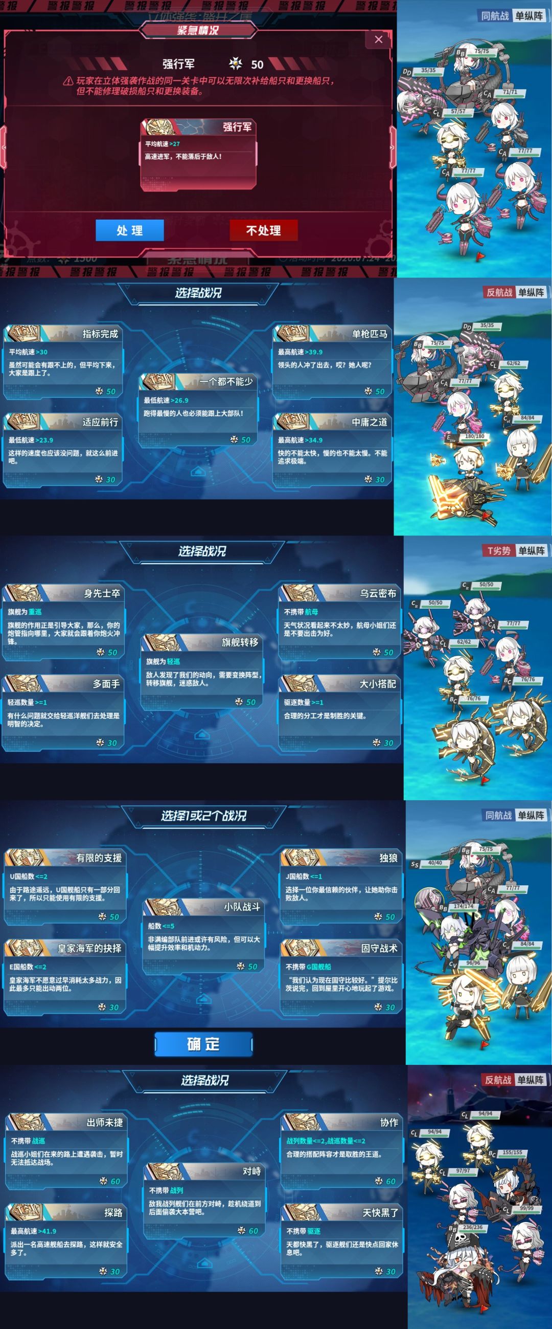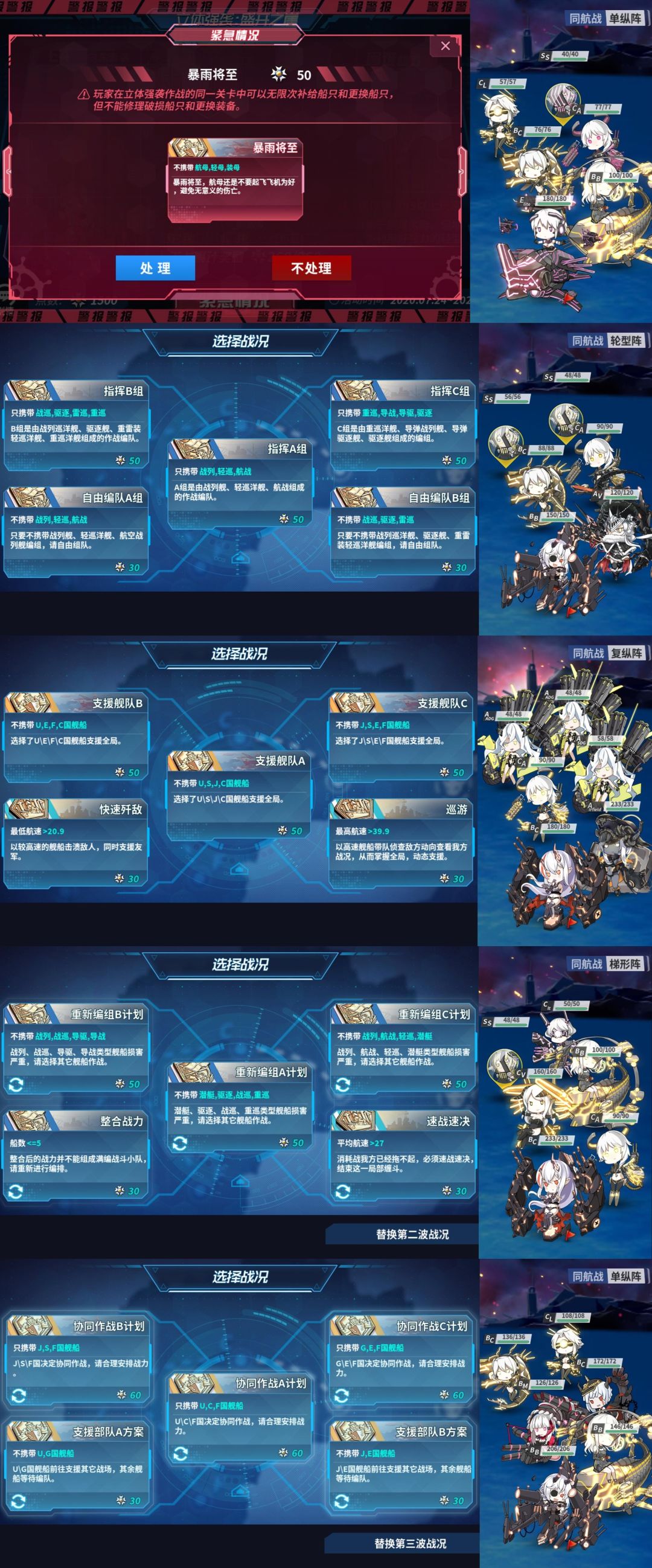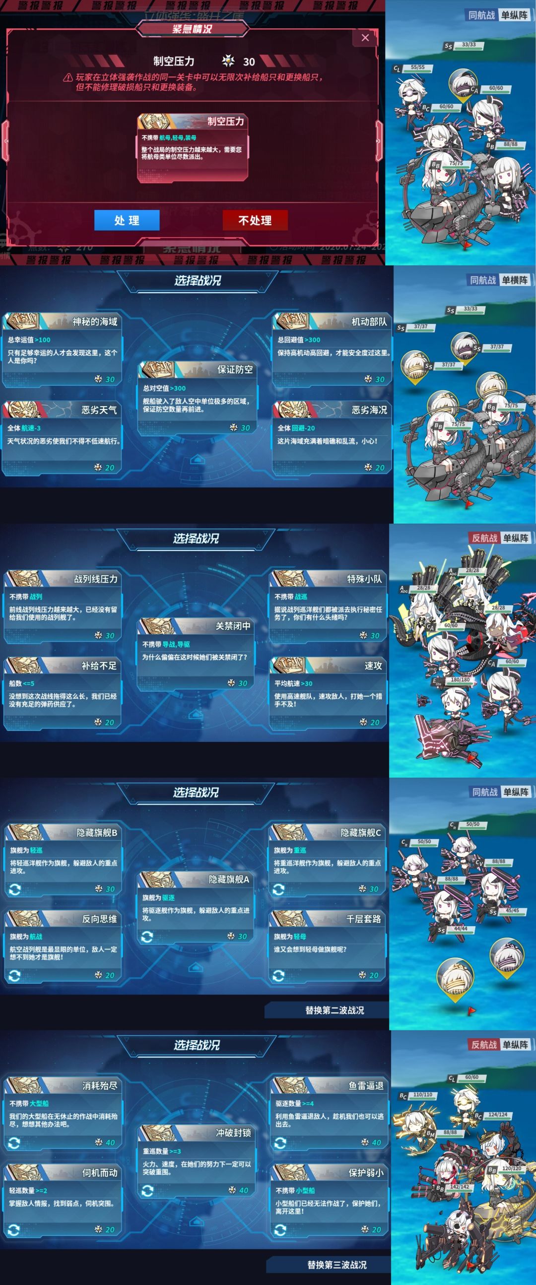 选择的路线:不处理紧急战况;第二波选择旗舰驱逐;第三波选择不带中船;第四波选择全体幸运 5以及全体火力 10,装甲-10;第五波选择平均航速>30