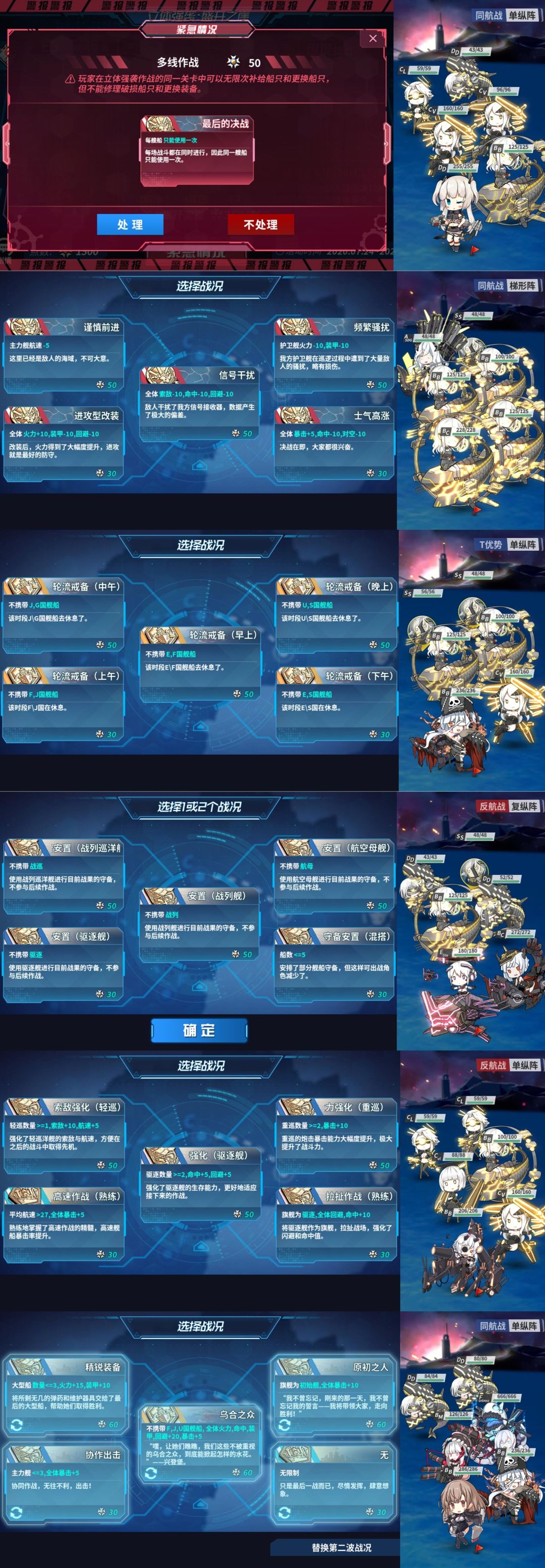选择的路线:处理紧急战况;第二波选择护卫舰火力-10,装甲-10;第三波选择不携带EF国;第四波选择不携带战巡以及不携带航母;第五波选择轻巡≥1,索敌 10,航速 5;第六波选择旗舰初始,全体暴击 10
