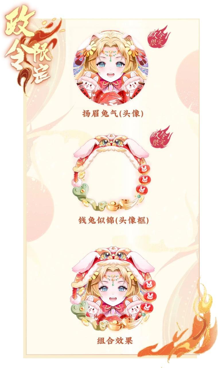 新的一期上凰政令将于1月2日0:00开启,提升政令等级,购买进阶方案,有机会获得全新头像“扬眉兔气 ”、头像框/气泡框“钱兔似锦”