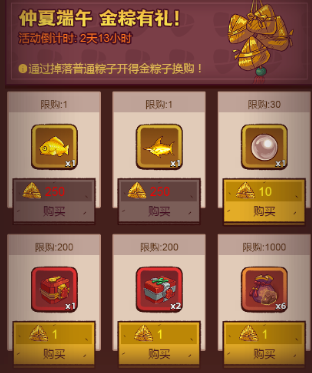 其中每个任务都是有星级,最高星级是五星,星级越高完成任务获得的粽子和鼓槌越多,普通粽子能开出大量资源,运气号还可以开出稀有的金棕。获得一定数量的金粽可以用来兑换稀有资源(金色鱼灵,珍珠等等)72个粽子开出的奖励: