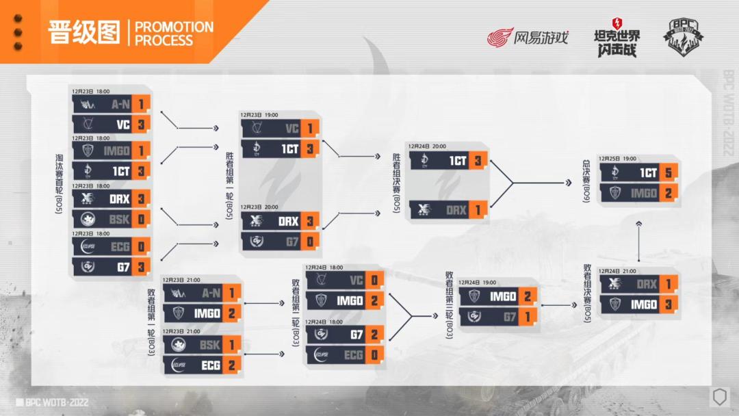 12月23日18时,战火杯冠军赛正式开战。根据积分排名,A-N、IMGO-、-DRX-、-ECG-、G7、-BKS-、1CT和-VC-八支晋级战队捉对厮杀。令人吃惊的是,“下克上”成为了首轮淘汰赛的主旋律——积分排名第八的VC,第七的1CT和第五的G7分别战胜了自己的对手,挺进胜者组第一轮。而积分赛中表现亮眼的A-N和IMGO-战队却早早落入了败者组,让人感叹坦克对战的变幻莫测。