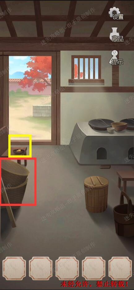 1、拾取场景中的物品:左边椅子上的炸豆腐和左侧的竹筐。其中炸豆腐是藏品,与动画片剧情有关,不用于解谜,图中用黄色方框框出。1