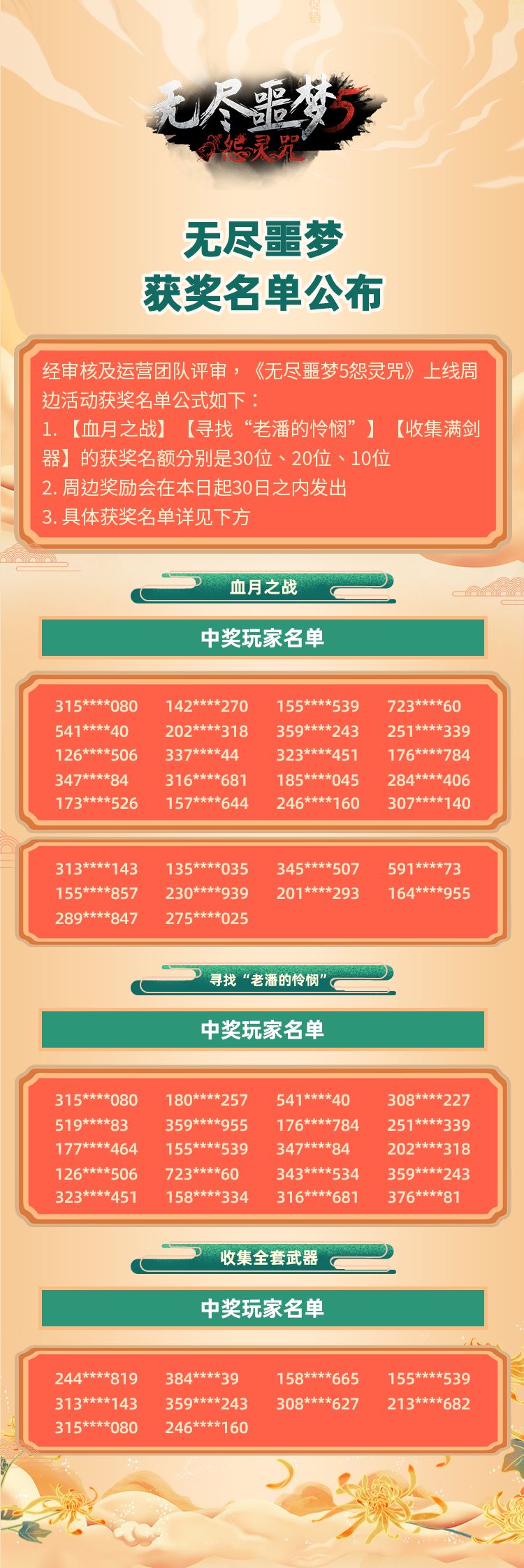 《无尽噩梦5怨灵咒》上线后我们为大家准备了3个送周边的活动,现在为大家公布获奖名单!恭喜以下大大获得精美周边~没有获得周边的大大也不要遗憾,还可以参与上线分享活动,也有机会获得周边奖励哟!(*^_^*)