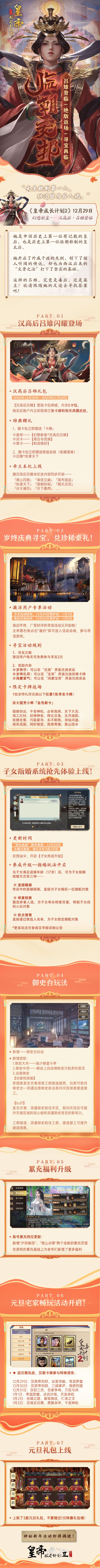 《皇帝成长计划2》于12月29日(周四)早上07:00-10:00进行本周的版本更新(期间可正常登录游戏),如有变动一切以游戏内正式公告为准。