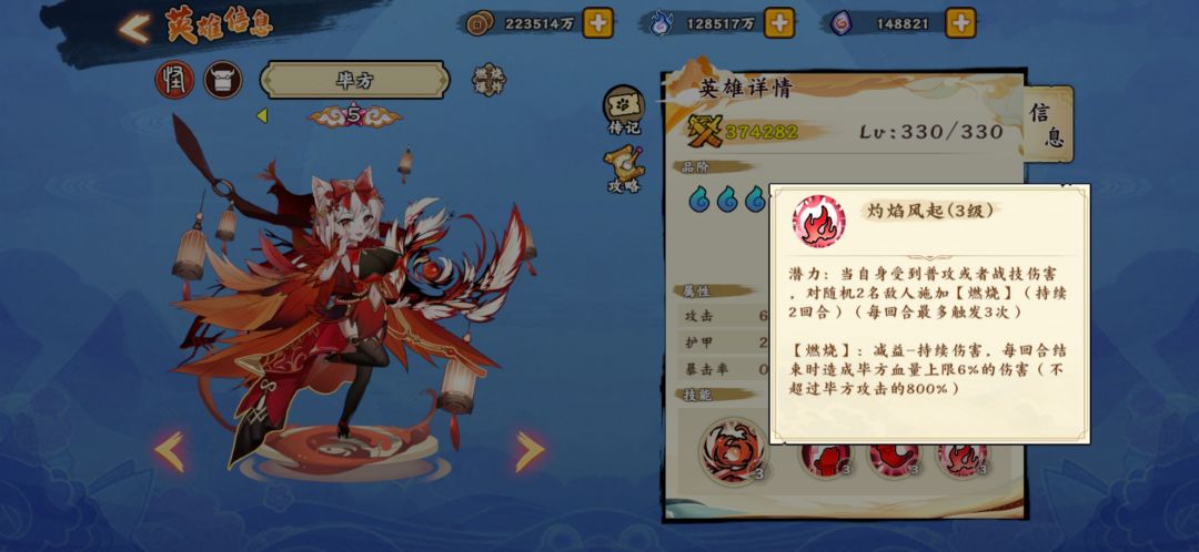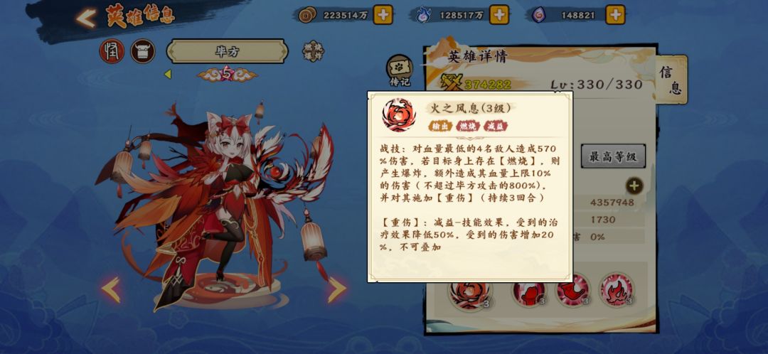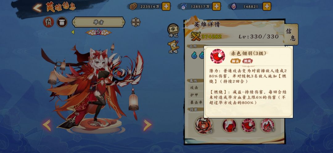 可以发现毕方是主打持续伤害和重伤的,但是坦度差了一些,培养性价比不高,如果决心要培养的话,需要几个辅助英雄来保护她。