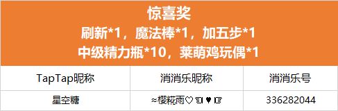 活动参与人数每超过50人,随机抽选1名送出:刷新*1,魔法棒*1,加五步*1,中级精力瓶*10,莱萌鸡玩偶*1;