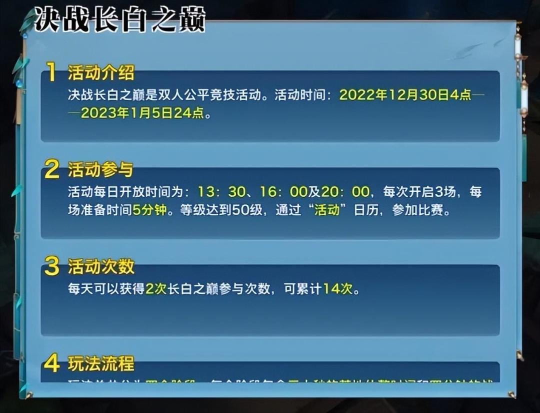 风雪不侵新岁,决战长白之巅。全新升级双人公平竞技决战长白之巅2022年12月30日-2023年1月5日限时开启!