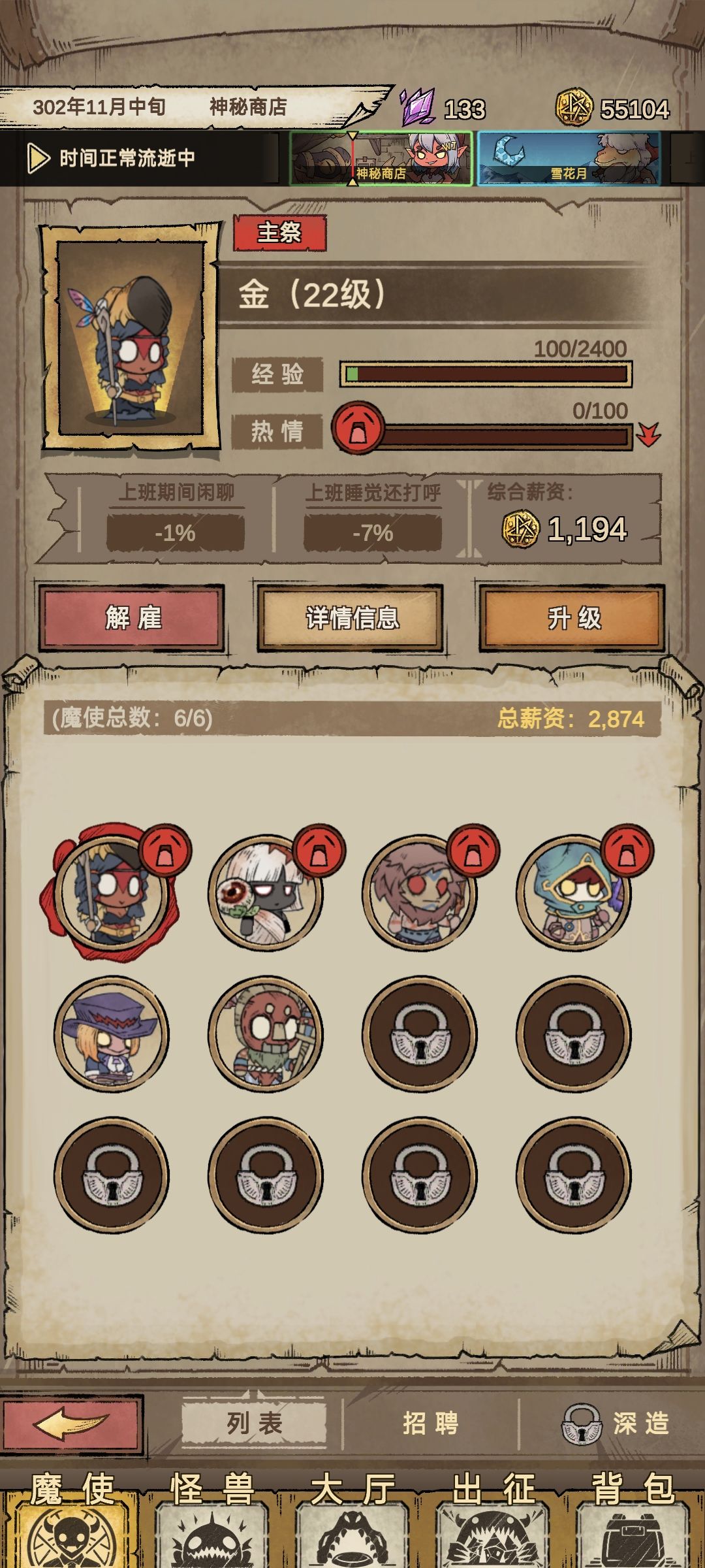只要一直召唤不停就算热情为零也不会辞职不给他辞职的时间