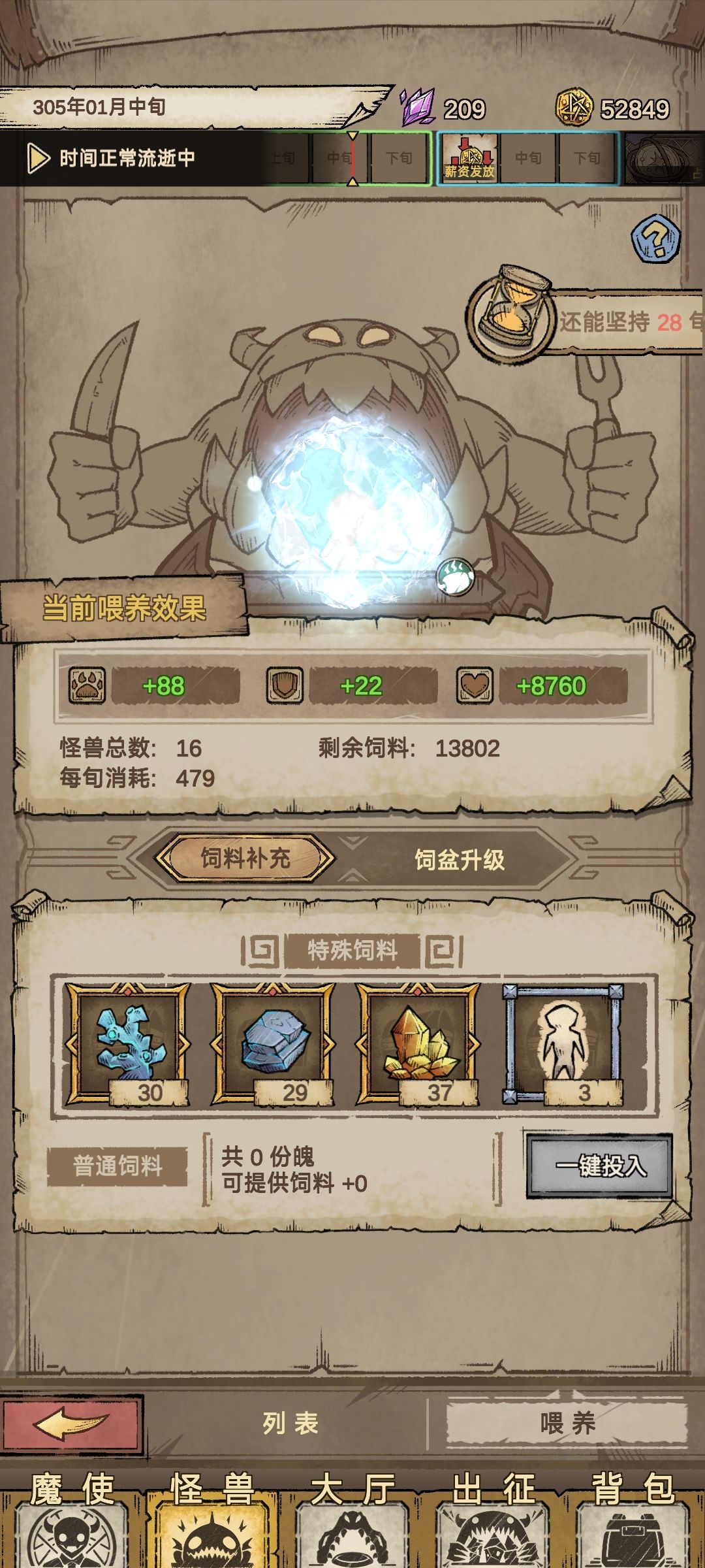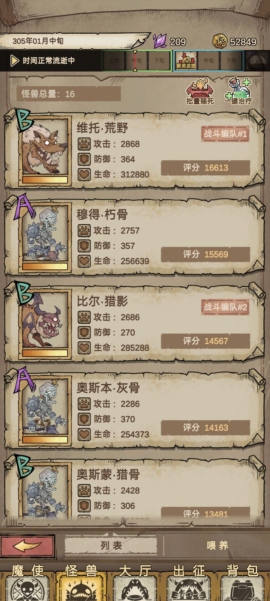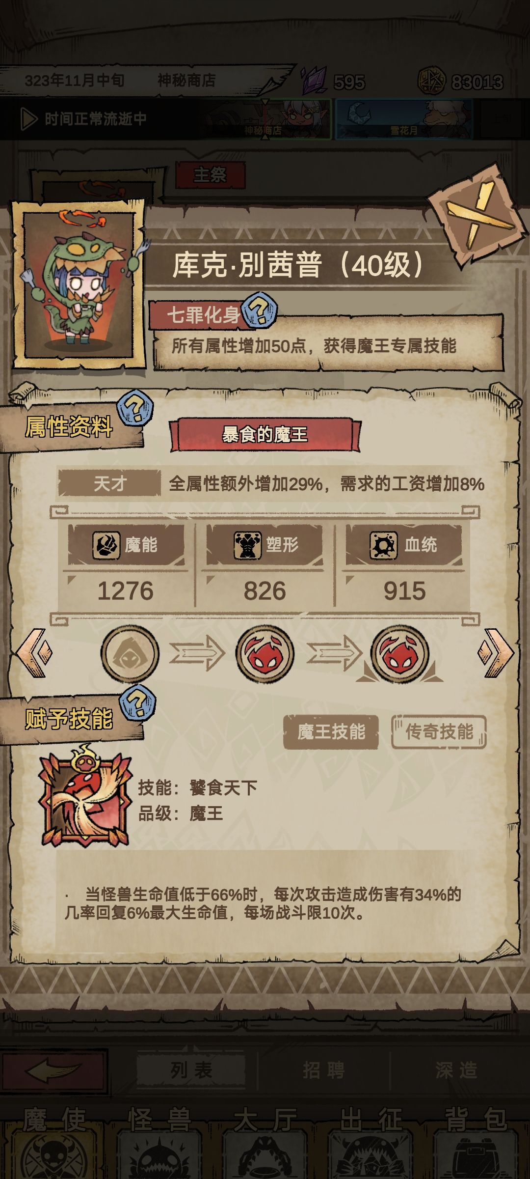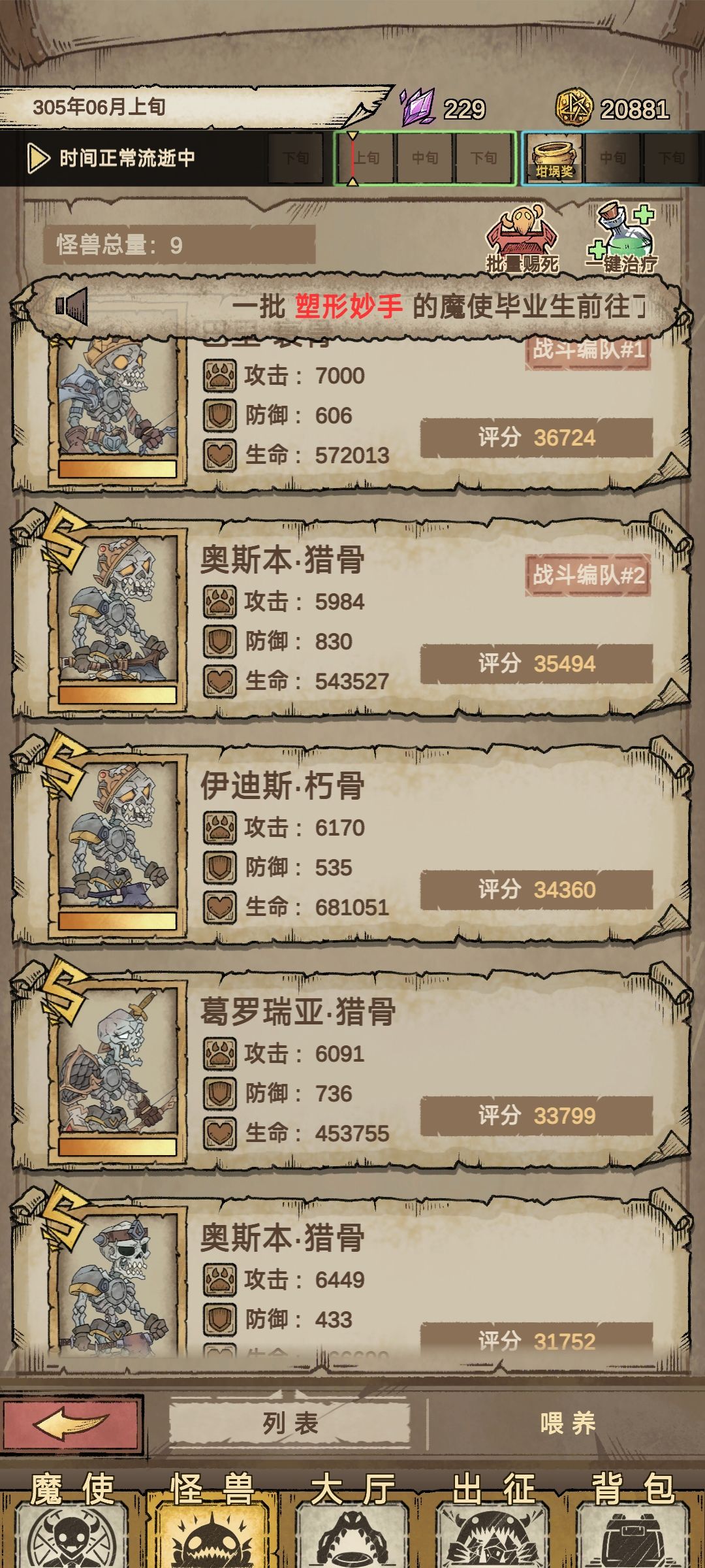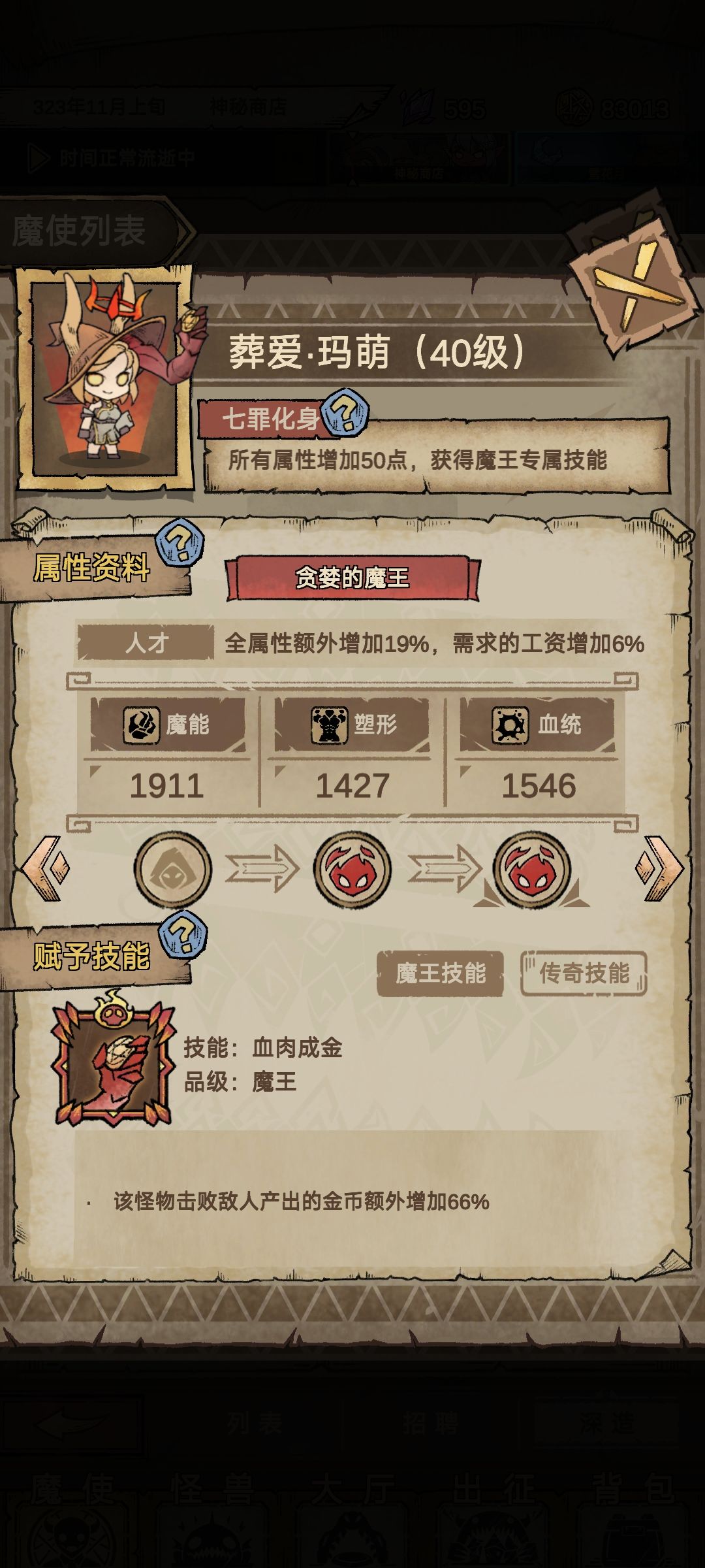 过了第一关选择魔兽对应暴食任务,可以一直刷熟练度钱不够就出征,一直招聘一直刷魔兽熟练度