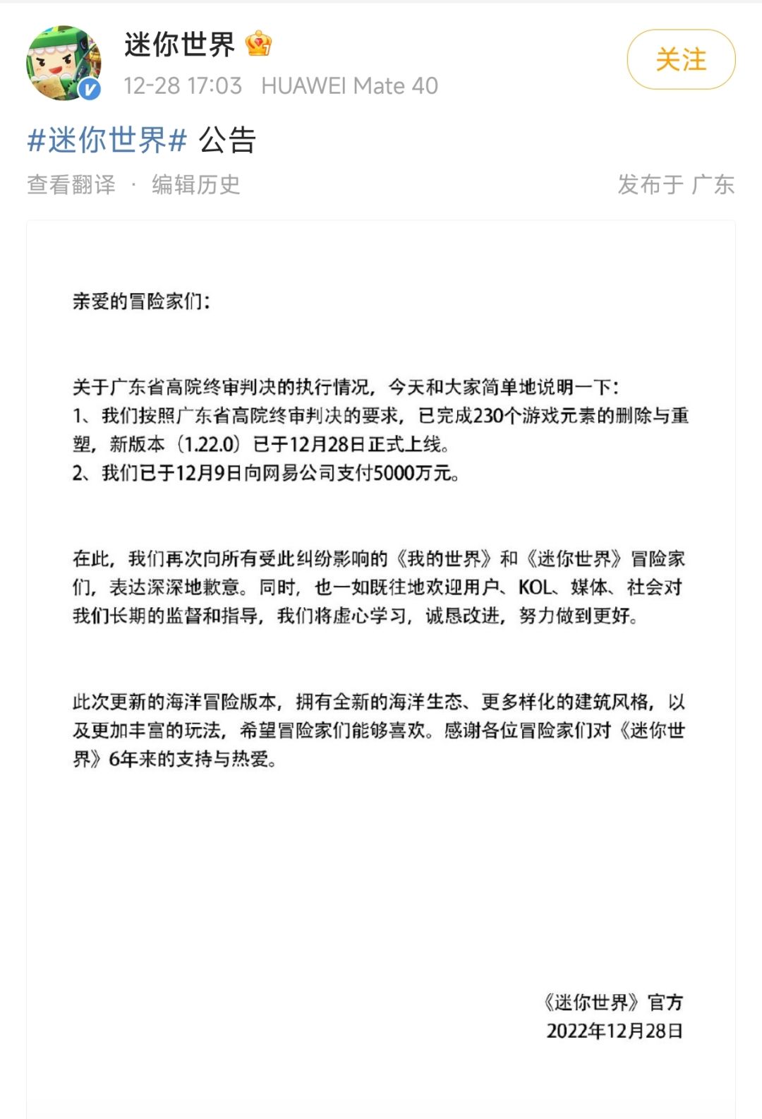 【吃瓜】《迷你世界》发布道歉声明,已经整改游戏并赔付网易5000万